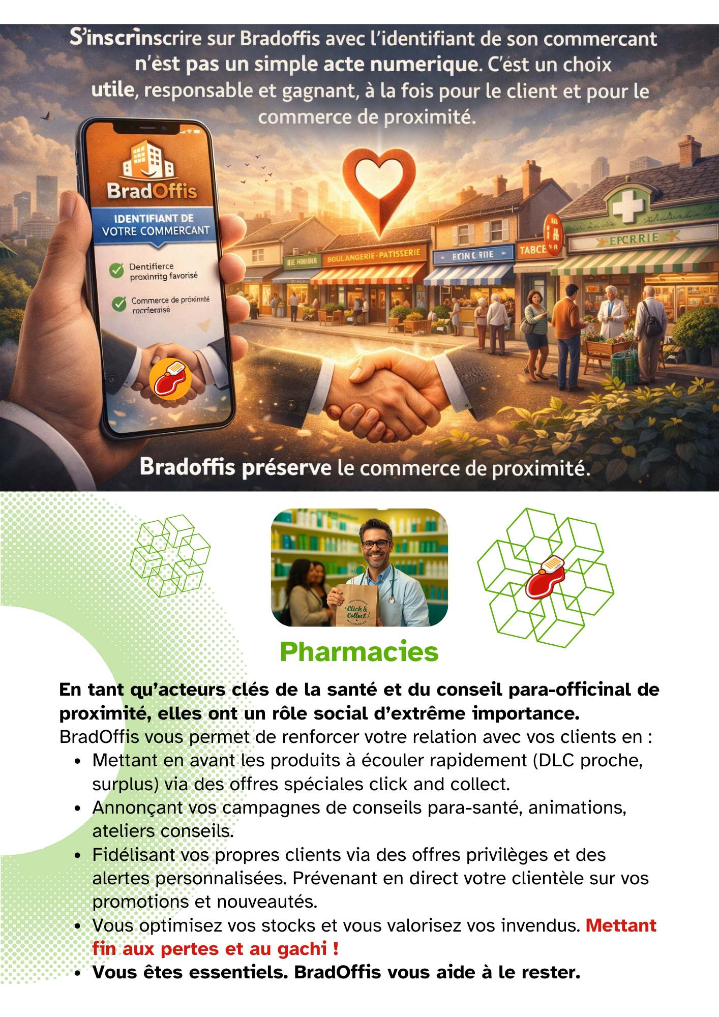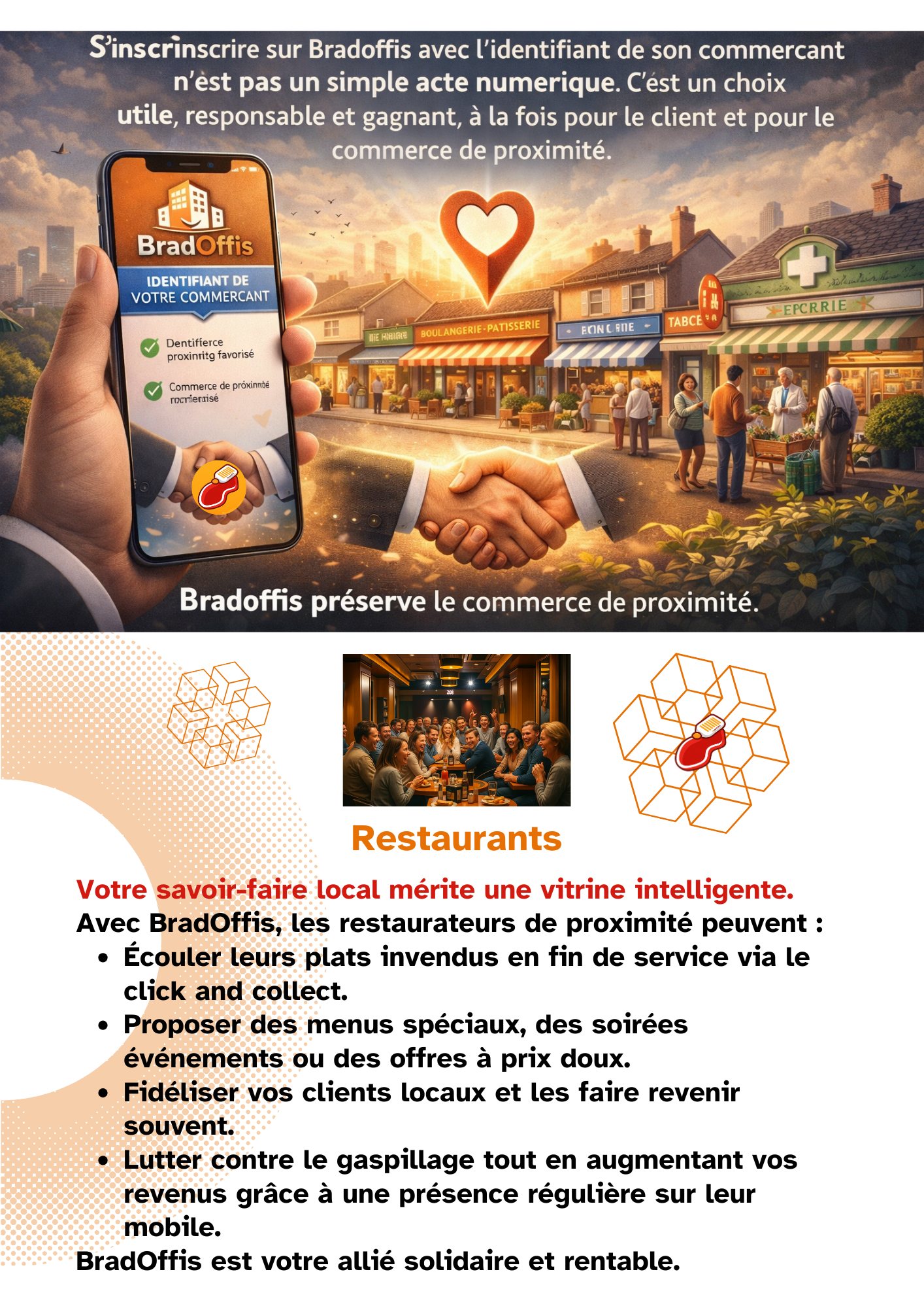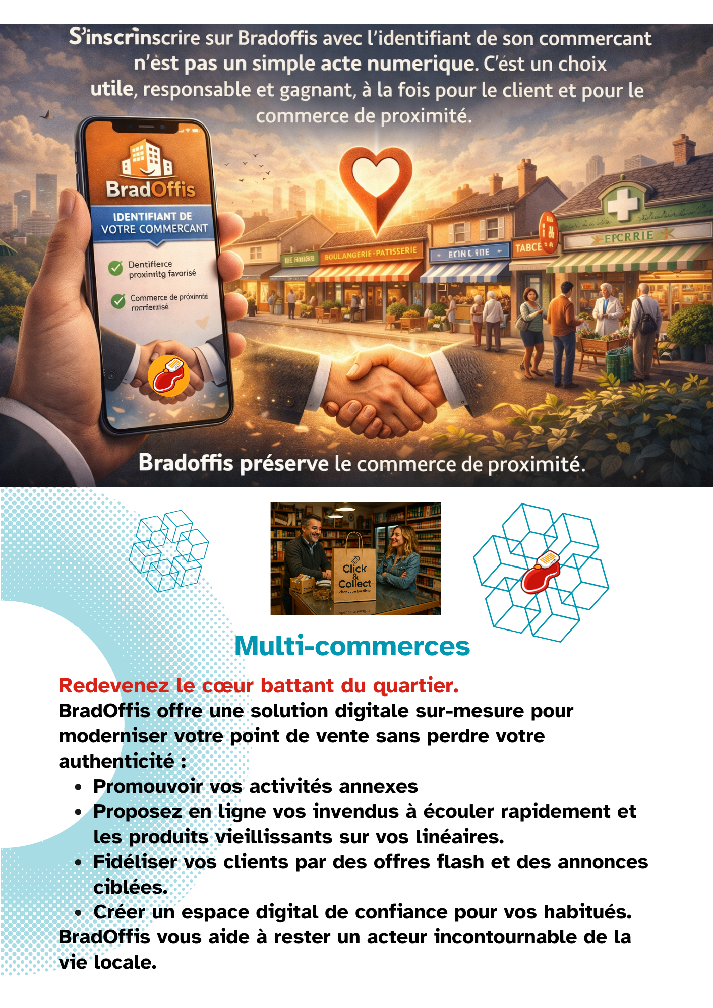 Face à la montée en puissance de la vente en ligne et à la fermeture progressive des petits commerces, BradOffis propose une solution concrète : une plateforme digitale qui renforce les liens entre les multi- commerces et leurs clients tout en luttant contre le gaspillage, l’inflation abusive et la fermeture des commerces de proximité provoquant la désertification des territoires.
