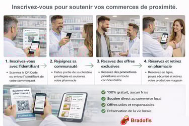 Grâce à Bradoffis, le client s’inscrit gratuitement avec l’identifiant de son commerçant favori, directement en magasin ou à distance, en quelques secondes. Il rejoint ainsi la communauté locale de son commerce de proximité et peut consulter, sans obligation d’achat, les offres et promotions proposées sur des produits utiles et responsables, notamment en parapharmacie. Lorsqu’une offre l’intéresse, il réserve et règle en ligne en toute simplicité, puis vient retirer son produit directement en pharmacie. Ce fonctionnement permet au client de faire des économies tout en soutenant activement ses commerçants locaux, en préservant le lien humain et en contribuant à la vitalité économique de son quartier ou de son village.