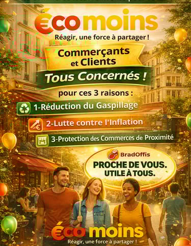 Il est important d’afficher qu'Éco Moins incarne un engagement envers moins de gaspillage, moins d'inflation abusive et moins de fermetures de commerces. En produisant plus de richesse locale, cela contribue à rentabiliser les commerces de proximité, transformer leur gestion et valoriser leur offre. Cette approche permet de renforcer l'image des commerçants tout en attirant une clientèle soucieuse de consommer de manière responsable et locale. Grâce à Éco Moins via Bradoffis, les commerçants disposent des outils nécessaires pour s'adapter aux attentes du marché actuel, créant ainsi une dynamique commerciale favorable qui préserve le tissu économique local.
