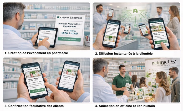 Le pharmacien crée et programme son événement directement depuis son espace Bradofis, en quelques clics, sans coût supplémentaire.