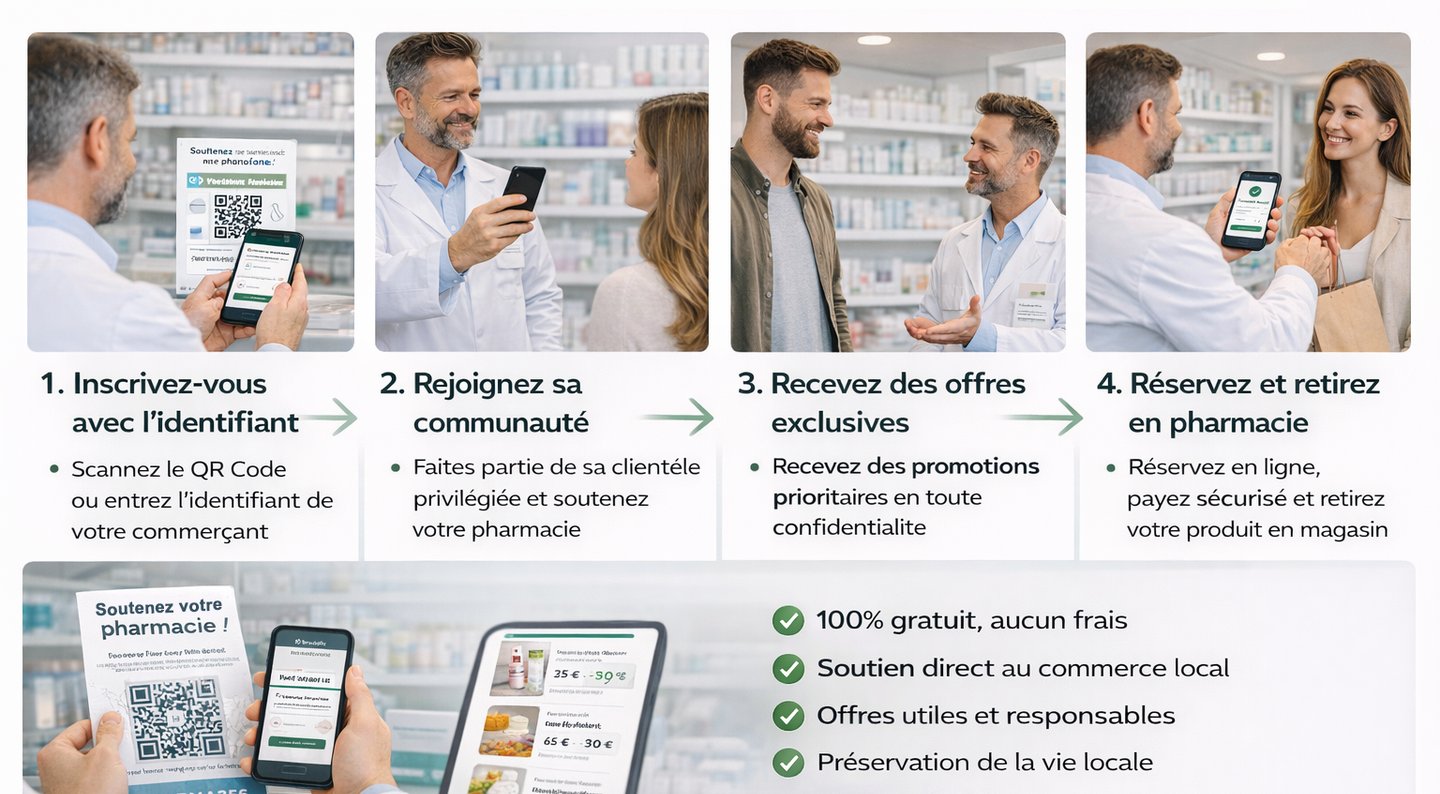 Grâce à Bradoffis, le client s’inscrit gratuitement avec l’identifiant de son commerçant favori, directement en magasin ou à distance, en quelques secondes. Il rejoint ainsi la communauté locale de son commerce de proximité et peut consulter, sans obligation d’achat, les offres et promotions proposées sur des produits utiles et responsables, notamment en parapharmacie. Lorsqu’une offre l’intéresse, il réserve et règle en ligne en toute simplicité, puis vient retirer son produit directement en pharmacie. Ce fonctionnement permet au client de faire des économies tout en soutenant activement ses commerçants locaux, en préservant le lien humain et en contribuant à la vitalité économique de son quartier ou de son village.